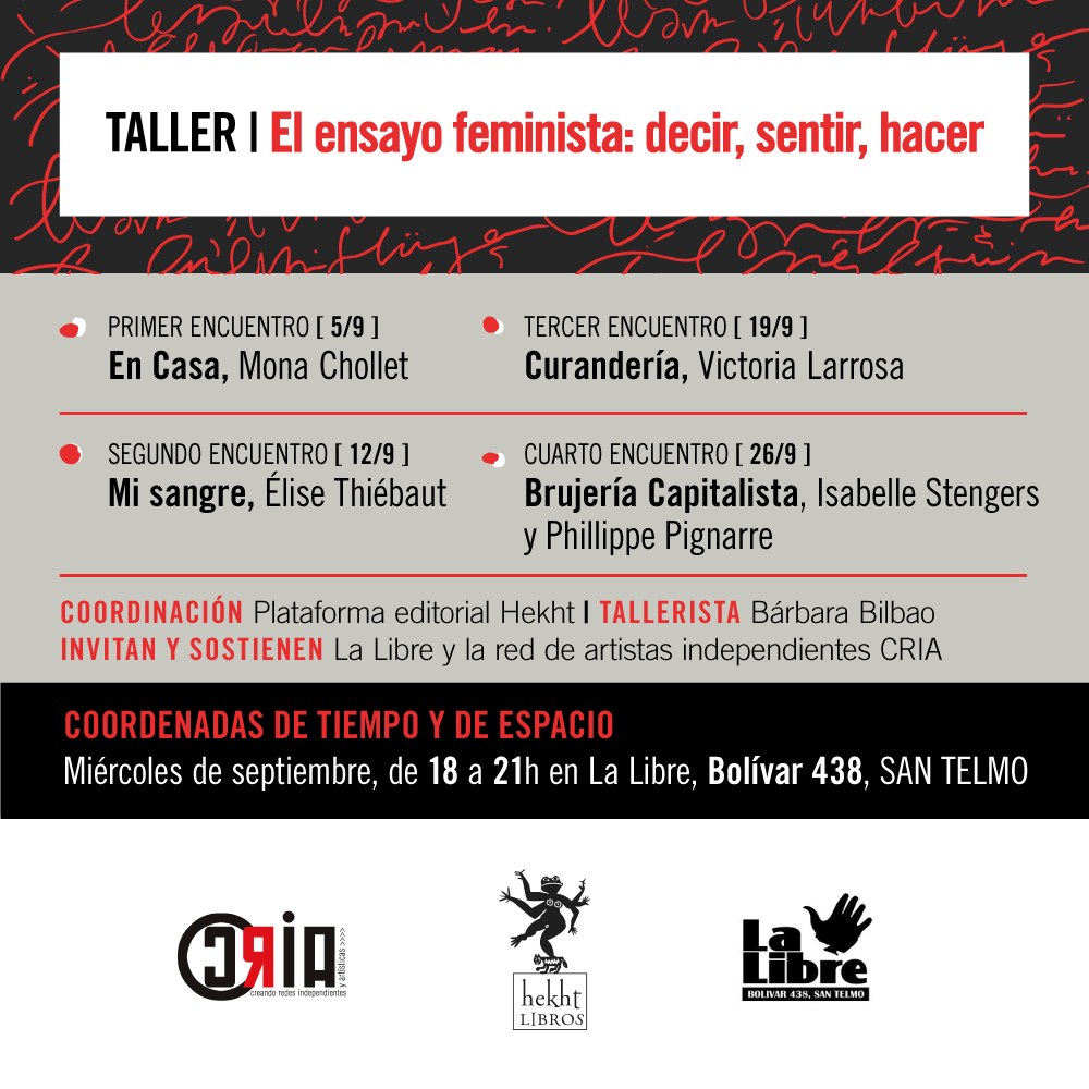 Este taller se propone como un espacio de encuentro y elucubración de voces que convergen en tiempo y espacio, o no lo hacen. Se trata de pensar prácticas y situaciones que no evidenciamos, muchas veces, como centrales. Quizás porque hayan necesitado de algún ojo y oído sensible para poder abordarlas. Esto nos propone Hekht en los cuatro títulos del taller, una escritura sensible, firme, política y feminista de universos disidentes. Trincheras de territorios contingentes: la casa, la brujería, la curandería, la sangre. Palabras, signos y articulaciones con las cuerpas.