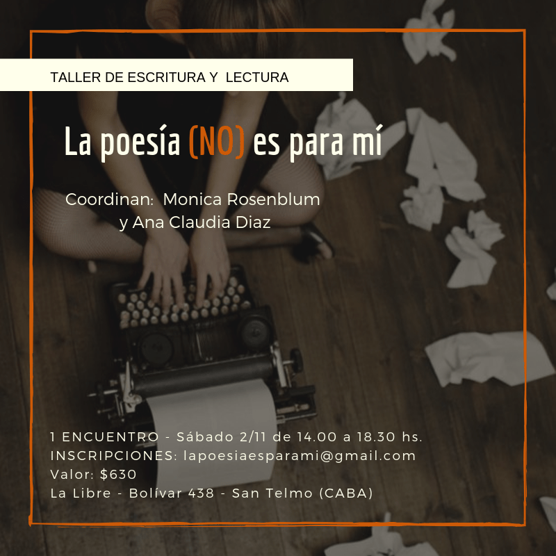 El sábado 2 de noviembre llega este taller de lectura y escritura de poesía de 1 solo encuentro. Un intensivo de 5 horas, con pausa, coordinadas por Monica Rosenblum y Ana Claudia Díaz.