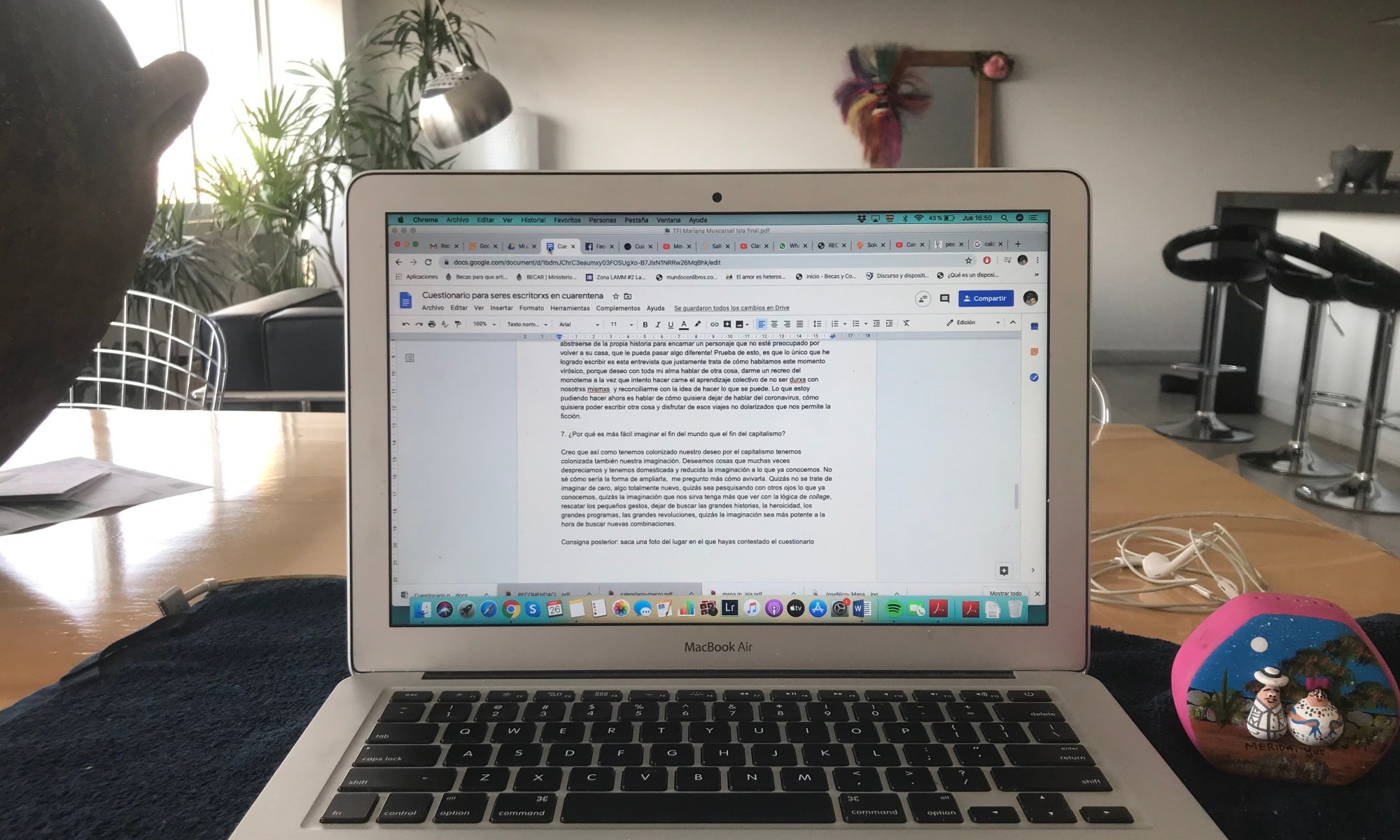 Siempre me funcionó escribir fuera de mi casa, no necesariamente en soledad, pero si con mucho tiempo disponible, por ejemplo en vacaciones. Pues no, ahora estoy en un lugar que no es mi casa, con tiempo libre y sin embargo no he logrado pensar en otra cosa que en esta situación en apariencia apocalíptica. Me doy cuenta entonces que no se trata en mi caso del lugar, sino de estar en un contexto que permita pensar en otra cosa, poder abstraerse de la propia historia para encarnar un personaje que no esté preocupado por volver a su casa, que le pueda pasar algo diferente. Prueba de esto, es que lo ùnico que he logrado escribir es esta entrevista que justamente trata de cómo habitamos este momento virósico, porque deseo con toda mi alma hablar de otra cosa, darme un recreo del monotema a la vez que intento hacer carne el aprendizaje colectivo de no ser durxs con nosotrxs mismxs y reconciliarme con la idea de hacer lo que se puede. Lo que estoy pudiendo hacer ahora es hablar de cómo quisiera dejar de hablar del coronavirus, cómo quisiera poder escribir de otra cosa y disfrutar de esos viajes no dolarizados que nos permite la ficción.