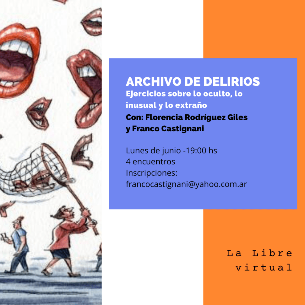 Los encuentros consistirán en una primera parte de lectura y conversación sobre los materiales sugeridos y una segunda parte de ejercicios prácticos, orientada a la producción y composición de archivos personales y colectivos de delirios. Los materiales propuestos serán provistos en forma gratuita. No se necesitan conocimientos ni experiencia previa. Modalidad virtual.