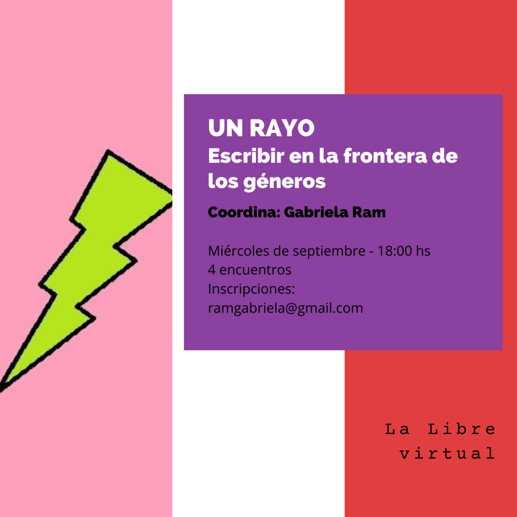 Un Rayo es un espacio práctico y virtual de escritura en el que apuntamos a impactar en las fronteras entre géneros literarios, disolverlas para armar en la fisura nuestros propios caminos de escritura y lectura. Buscaremos hacer del pasarse de la raya una forma propia de habitar los terrenxs de la escritura y dialogar allí con otras disciplinas que nos convocan. Un ánimo de pastiche en la ficción. Modalidad Virtual.
