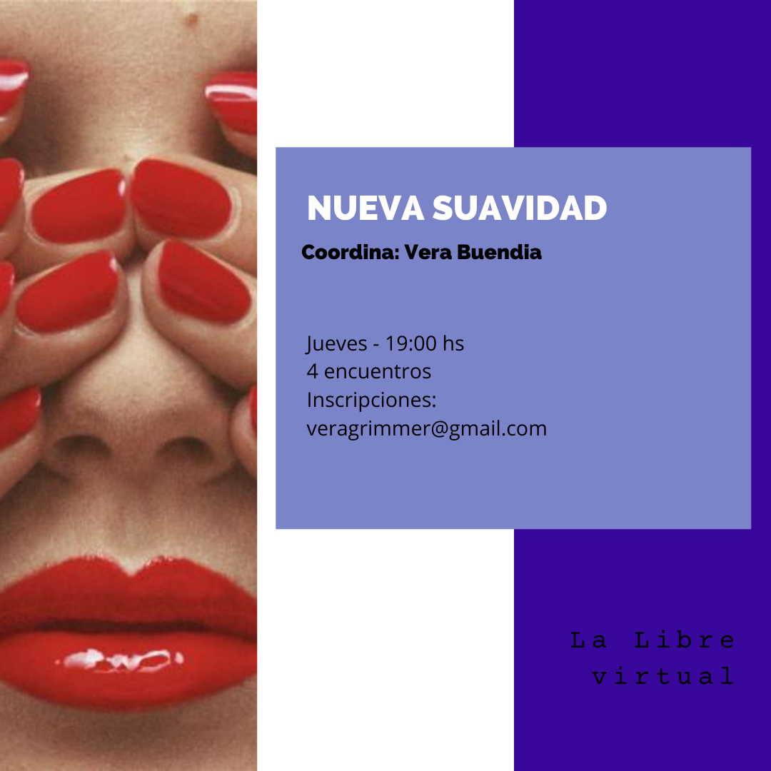 Nueva suavidad es un laboratorio de creación coordinado por Vera Buendía donde se trabajará en torno al amor: se crearán poemas, relatos, canciones, distintos tipos de reaciones dependiendo de lxs participantes.