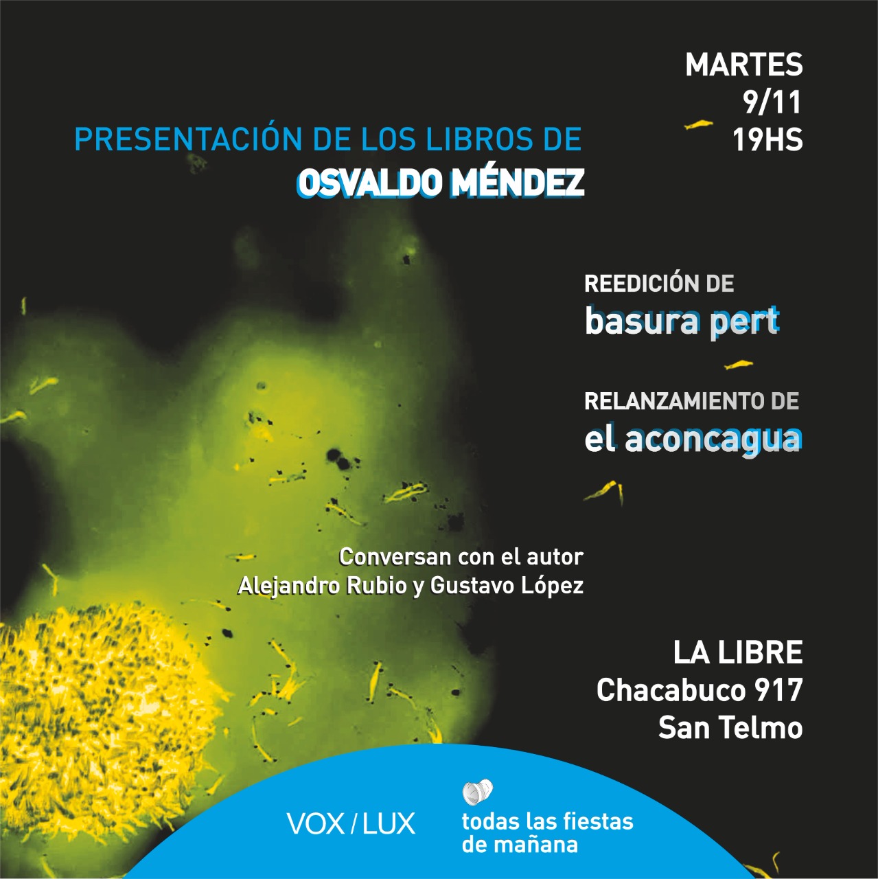 Reedición de “Basura pert”, editado por Todas las fiestas de mañana, y relanzamiento de “El Aconcagua”, editado por Vox. Acompañan Gustavo López y Alejandro Rubio.