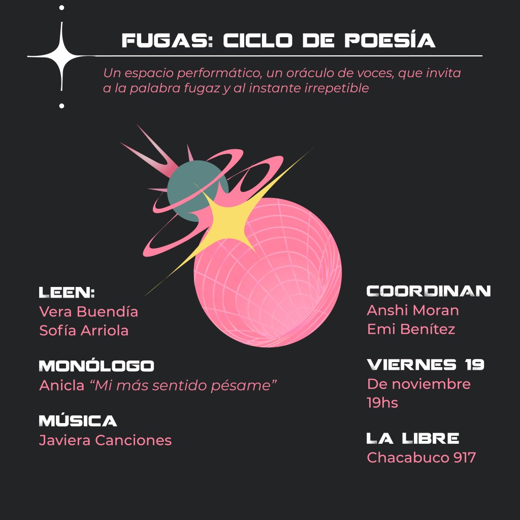 El Viernes 19/11 hacemos la segunda edición del CICLO FUGAS, un evento producido por Emi Benites y Anshi Moran para La Libre, donde buscamos poner la palabra de pie en sus diversas variantes: performance, poesía y música. Leen: Vera Buendía y Sofía Arriola. Monologuea: Anicla con “Mi más sentido Pésame”. Y nos trae Música: Javiera Canciones.