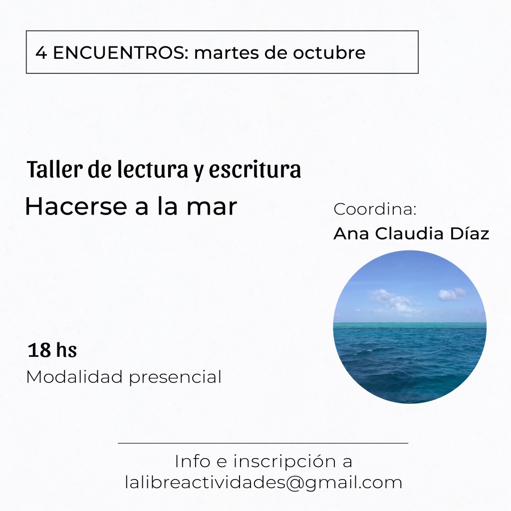 Este taller es un espacio pensado para abordar lecturas que rondan al mar y su imaginario y, a raíz de eso, incentivar la propia escritura. A través de ejercicios y distintas herramientas, emprenderemos un recorrido entre autorxs que hayan trabajado con esta temática; desde Sylvia Plath hasta Idea Vilariño, desde Ernest Hemingway hasta Haroldo de Campos. Explorando así, las múltiples aristas de la literatura cuando es atravesada por este imaginario.