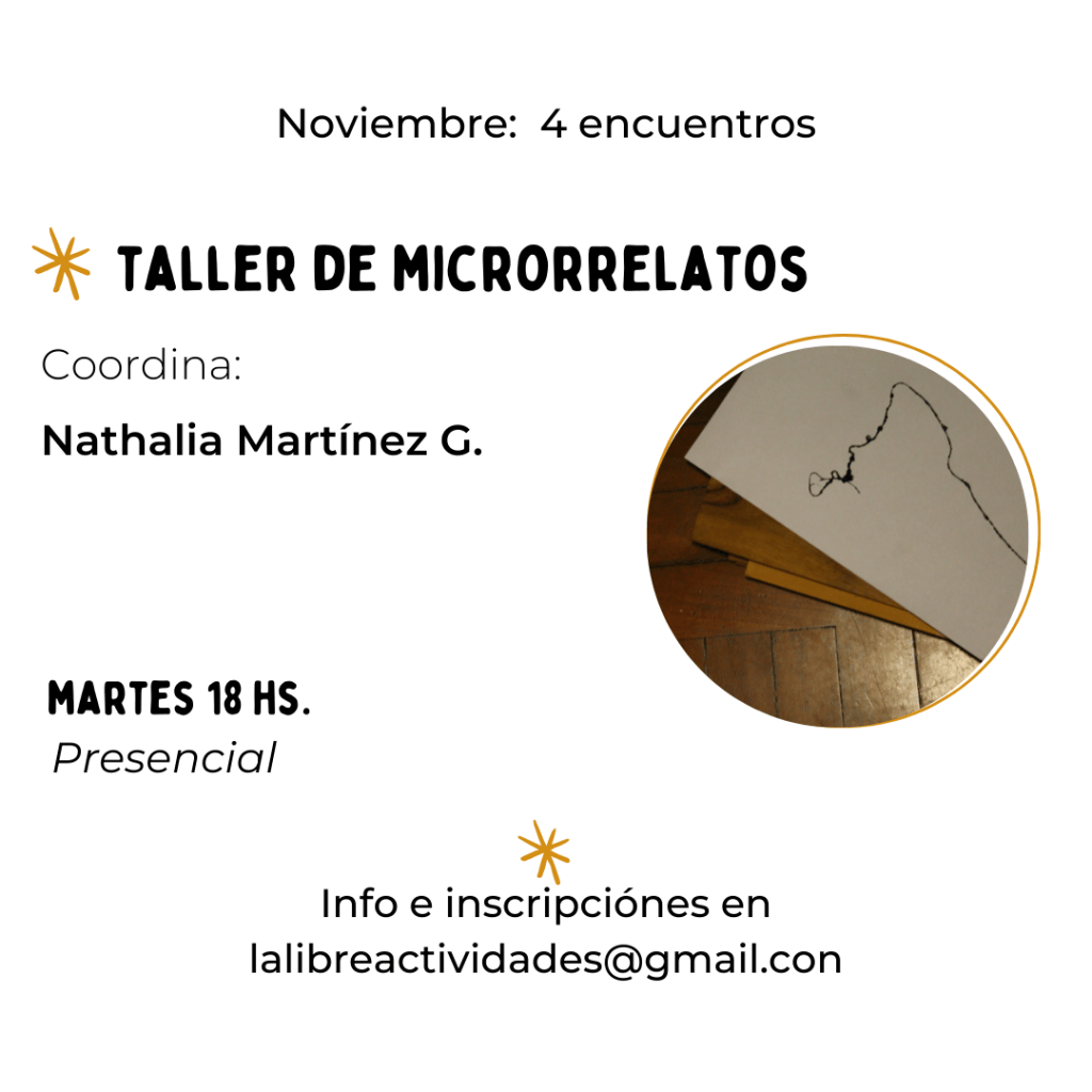 El objetivo de este taller es brindarles herramientas a los participantes para la escritura del microrrelato. Estas buscan estimular la creatividad por medio de estímulos sensoriales para generar diversas emociones y así ocupar un lugar por medio de la palabra.