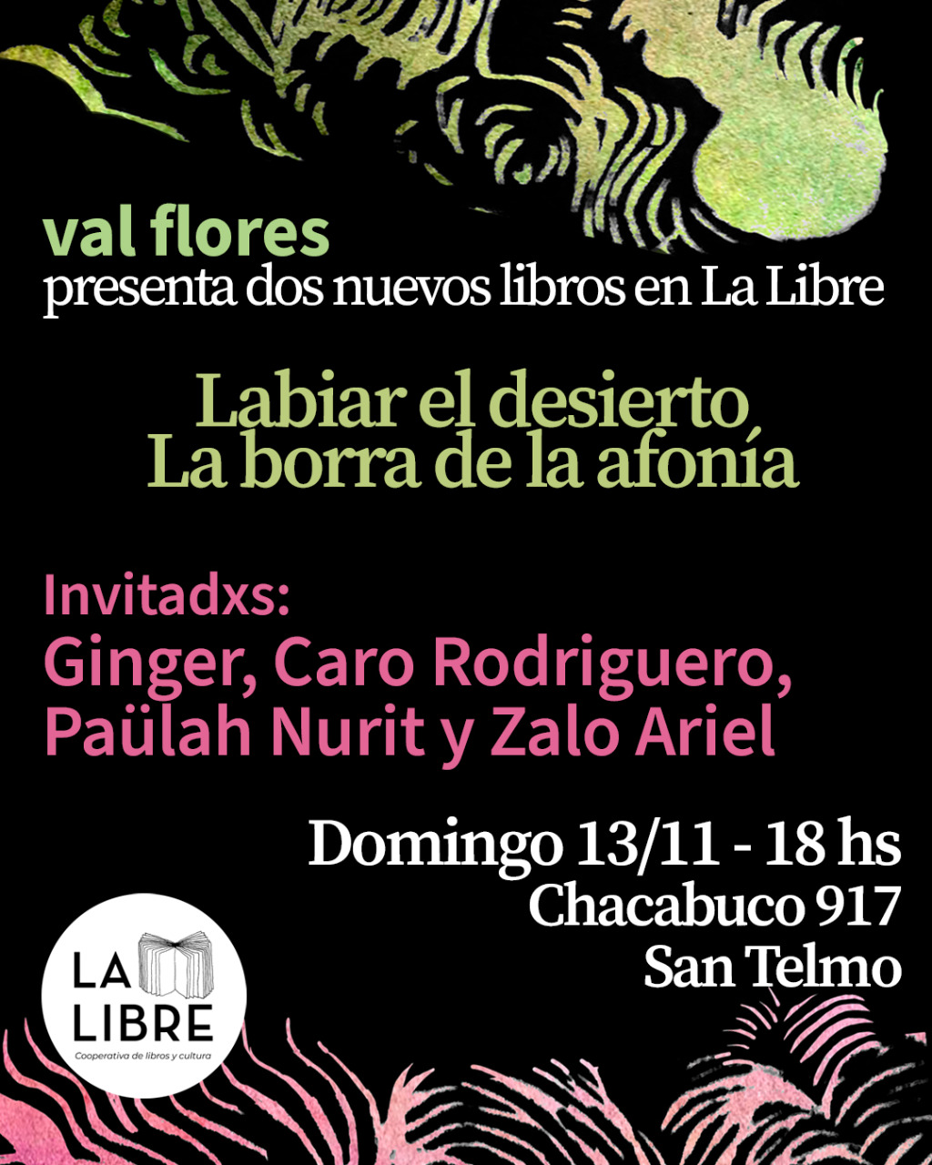 “la borra de la afonía” y “labiar el desierto” de val flores, editados por La Libre editorial, se presentan el domingo 13 de noviembre a las 18 hs. en Chacabuco 917, San Telmo. Con la participación de Ginger, Caro Rodriguero, Paülah Nurit y Zalo Ariel.
