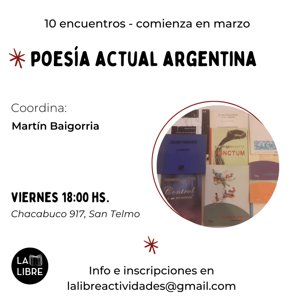 El curso consiste en una introducción a la poesía contemporánea argentina. Arrancamos con el neobarroco (Carrera, Perlongher), luego seguimos con el objetivismo (García Helder, Taborda, etc.) y después pasamos a la «poesía de los noventa» (Desiderio, Gambarotta, Laguna, etc.). Dedicamos las últimas dos reuniones a algunos escritores jóvenes que empezaron a publicar después de 2010 (Cortiñas, Pérez, Kesselman). A lo largo de diez encuentros propondremos un análisis de las obras concentrándonos en sus estrategias compositivas y algunos aspectos del contexto cultural e histórico.