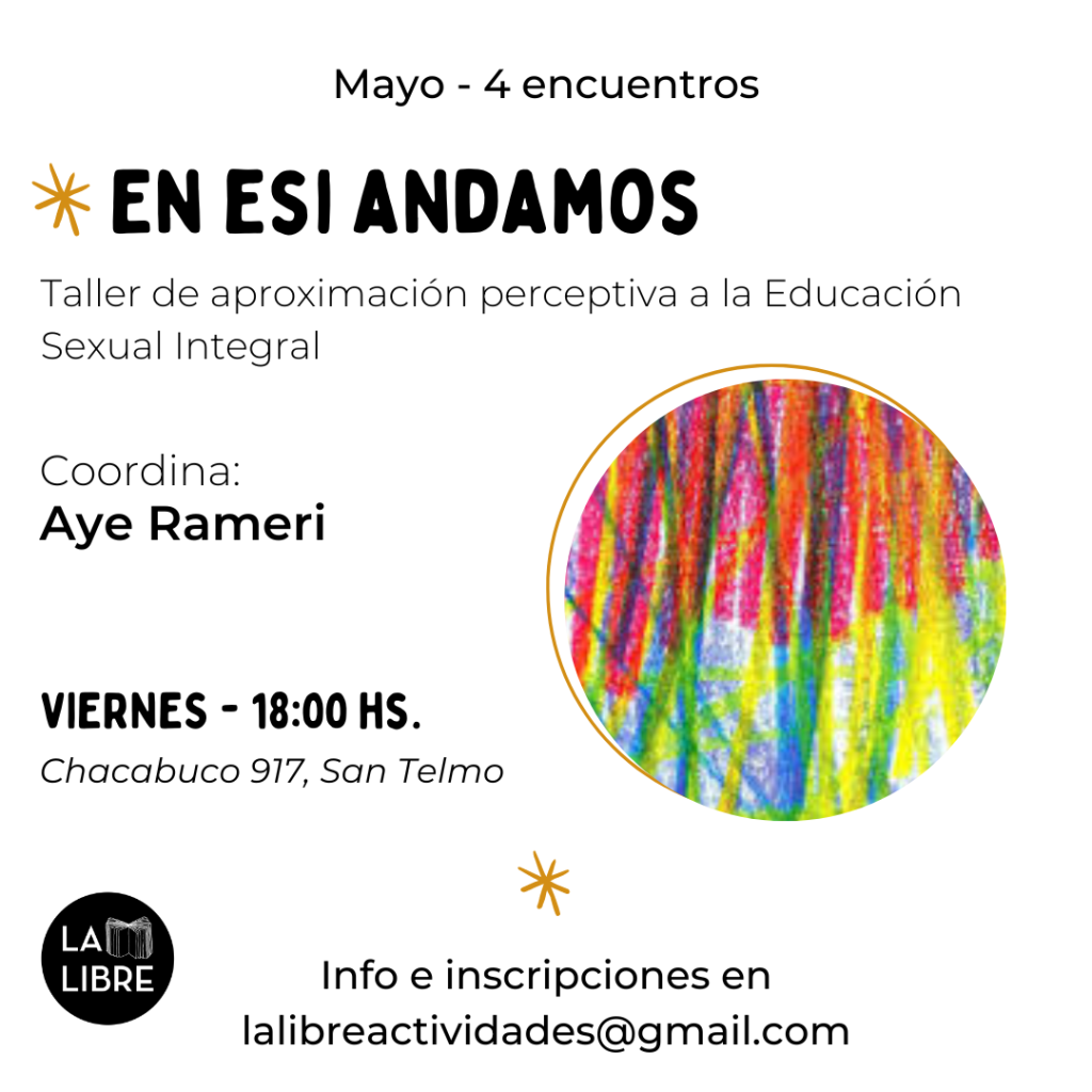 Este Taller se propone generar un espacio de diálogo y atención a lo que sentimos, desde el cuidado y el respeto, en el cual nos aproximaremos sensorial y perceptivamente a materiales y lenguajes anclados en la propuesta de la Educación Sexual Integral (ESI).