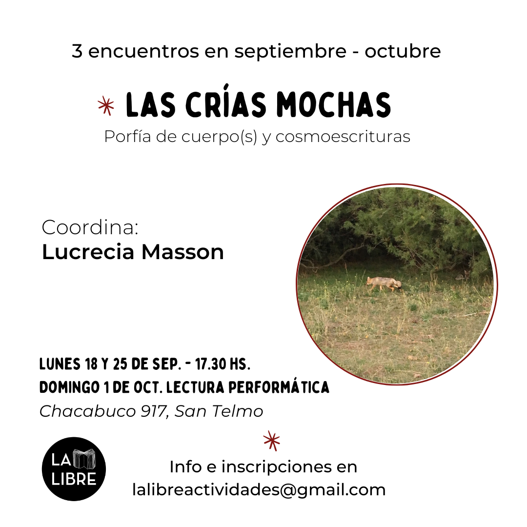 El nombre las crías mochas se inspira en una canción del payador mapuche Saúl Huenchul, cuya música canta e invoca al zorro, al nahuel, al jabalí y a la sequía, entre otros elementos que la modernidad dio en nombrar naturaleza. Nos ocuparemos de propuestas como esta y otras en tanto, creo, vuelven posible -y narrable- un gesto de desobediencia a los mandatos de separabilidad y pretensiones humanistas que occidente impone. Las crías mochas busca entonces ser un experimento anticolonial de escritura, de modo que, de la mano de esta apuesta, no queda más que darse a la tarea de desandar binomios como cuerpo-mente o humano-no humano, incluso teoría y práctica artística, incluso escritura y cuerpo(s).