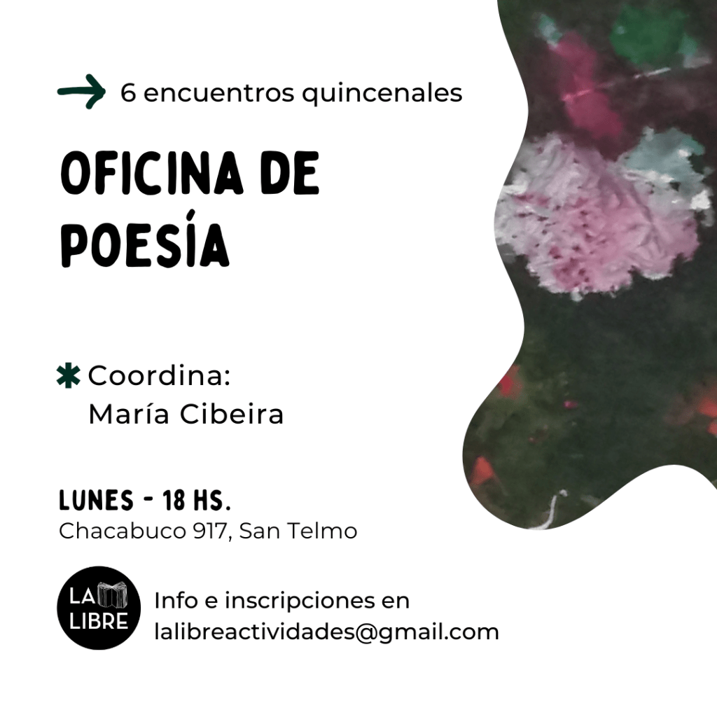 La oficina de poesía se dedicará al lenguaje hecho de palabras, entre otros posibles lenguajes de lo poético. Dispuesta alrededor de una mesa para encontrar algo que resuene, cada una, uno, une encontrará algo que pueda activar la escritura, la voz, un ritmo o una cadencia, la de cada quien.