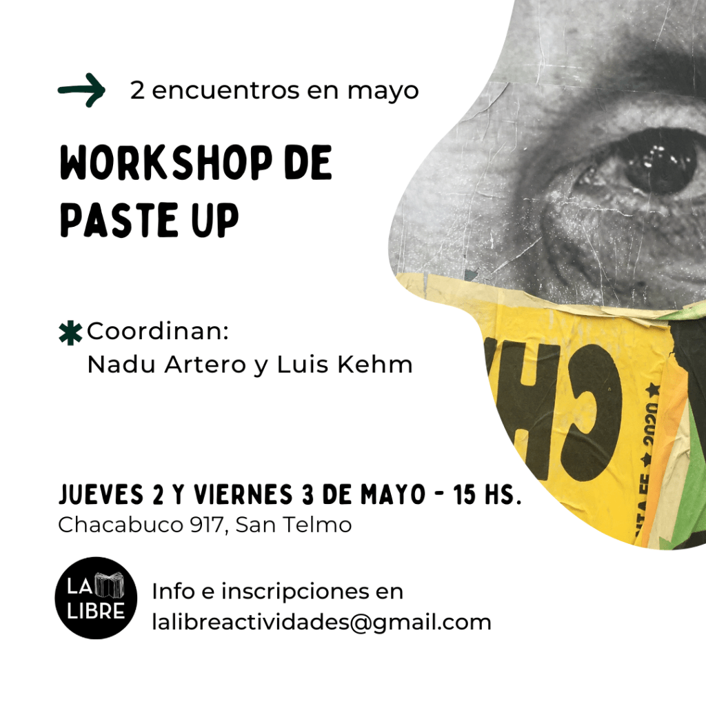 Ese es un taller teórico/práctico sobre la técnica de Paste Up. Consta de 2 unidades principales, que abarcan la historia del Paste Up y sus orígenes, referentes internacionales y naciones, materiales y herramientas a utilizar, diferentes formas de materializar las ideas (estampas, pintura, stencil, digitalización, etc) hasta su producción. Finalmente, cierre de workshop en la calle interviniendo una pared de forma colectiva. No se necesitan conocimientos previos.