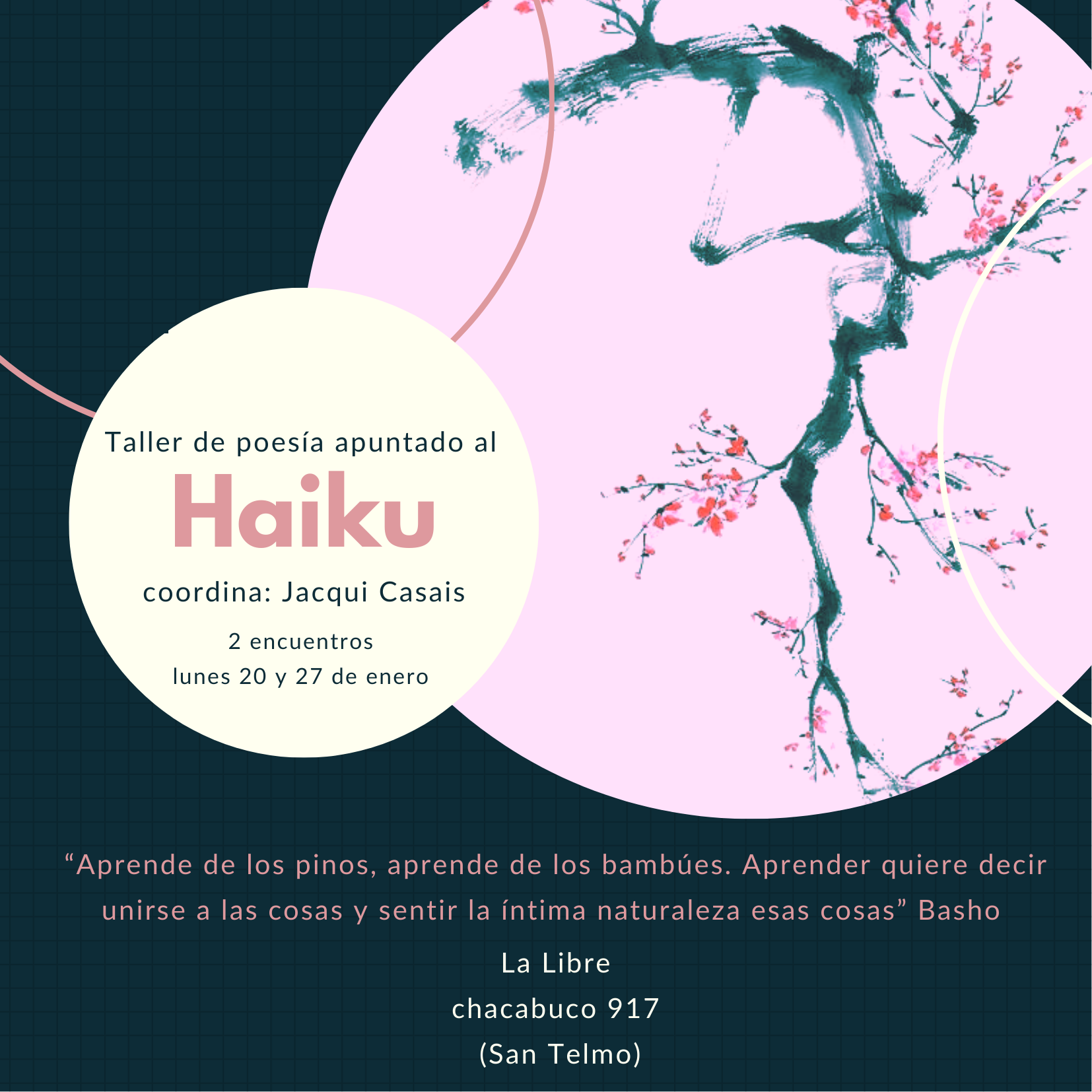 Taler de dos encuentros en enero: lunes 20 y 27 de enero de 19 a 20 hs. Este taller teórico-práctico, facilitará un acercamiento al haiku, forma poética de origen japonés y a poetas contemporánexs cuya obra esta inspirada en el espíritu del haiku.