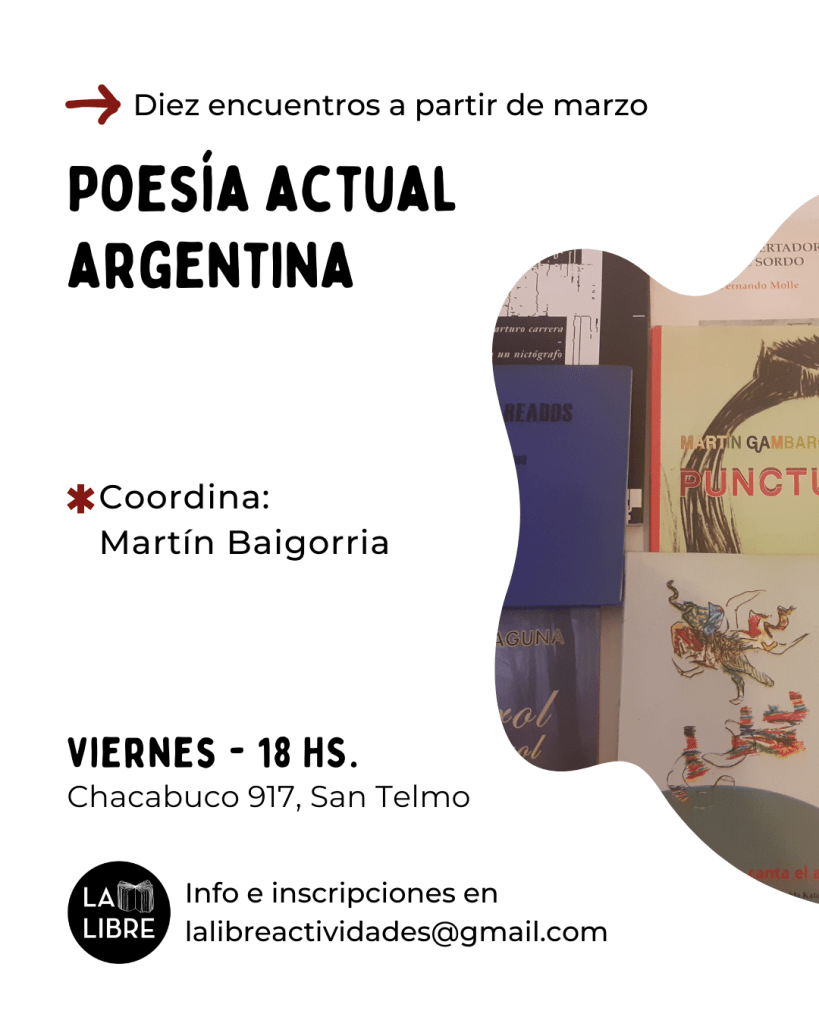 El curso consiste en una introducción a la poesía contemporánea argentina. Arrancamos con el neobarroco (Carrera, Perlongher), luego seguimos con los autores vinculados al objetivismo (García Helder, Taborda, etc.) y después pasamos a la «poesía de los noventa» (Desiderio, Gambarotta, Laguna, etc.). Dedicamos las últimas dos reuniones a algunos escritores jóvenes que empezaron a publicar después de 2010 (Cortiñas, Pérez, Kesselman).