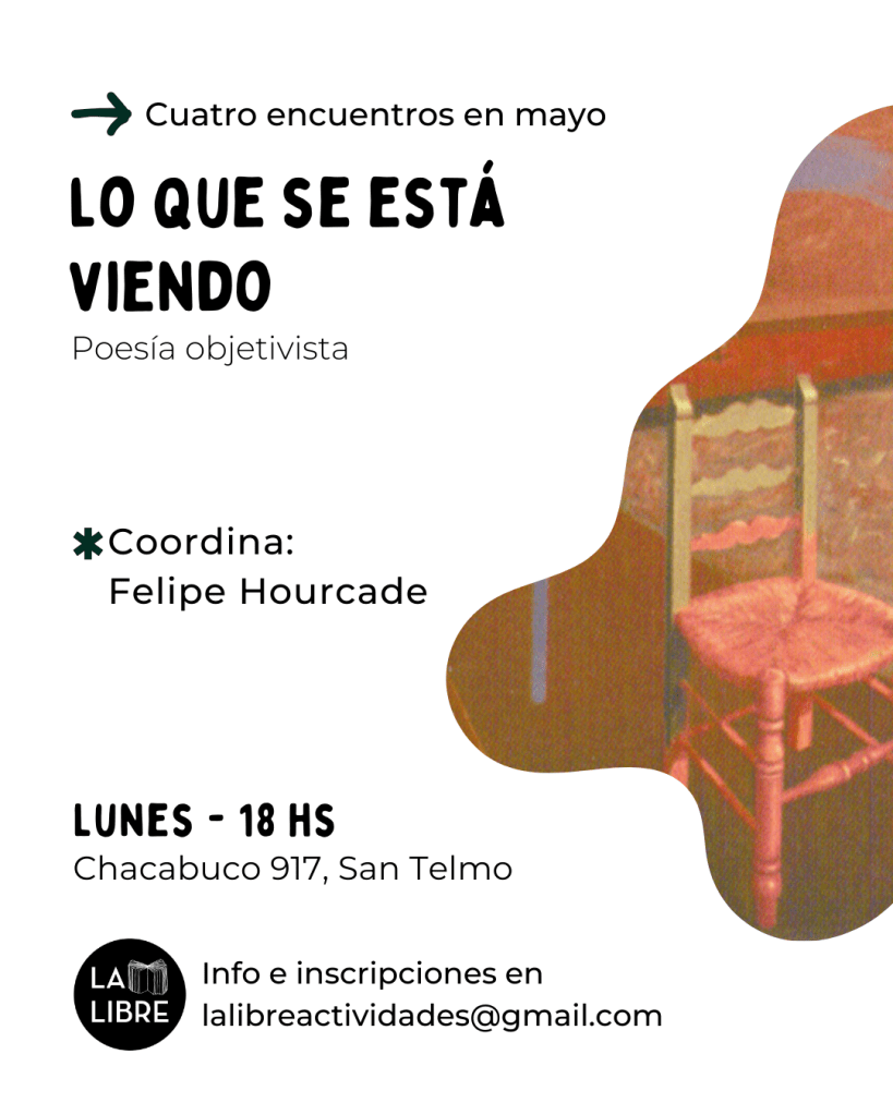 En el poema Poética de Giannuzzi leemos estos versos “No agregue. No distorsione./ No cambie/ la música de lugar./ Poesía/ es lo que se está viendo” que podrían sintetizar una de las características de la poesía objetivista argentina. Como señala Edgardo Dobry en el ensayo Poesía argentina actual: del neobarroco al objetivismo: “El poeta clásico veía en el paisaje una alegoría de un sistema divino; el romántico encontraba en las cosas una imagen invertida del yo; el poeta camarógrafo (objetivista) simplemente ve.” El taller Lo que se está viendo propone un recorrido a través de ensayos, poemas y libros de poemas que sientan las bases de la poesía objetivista argentina, un modelo estético que sigue repercutiendo (en las producciones poéticas, en los debates, en los análisis literarios), de diversas formas, hasta el día de hoy.