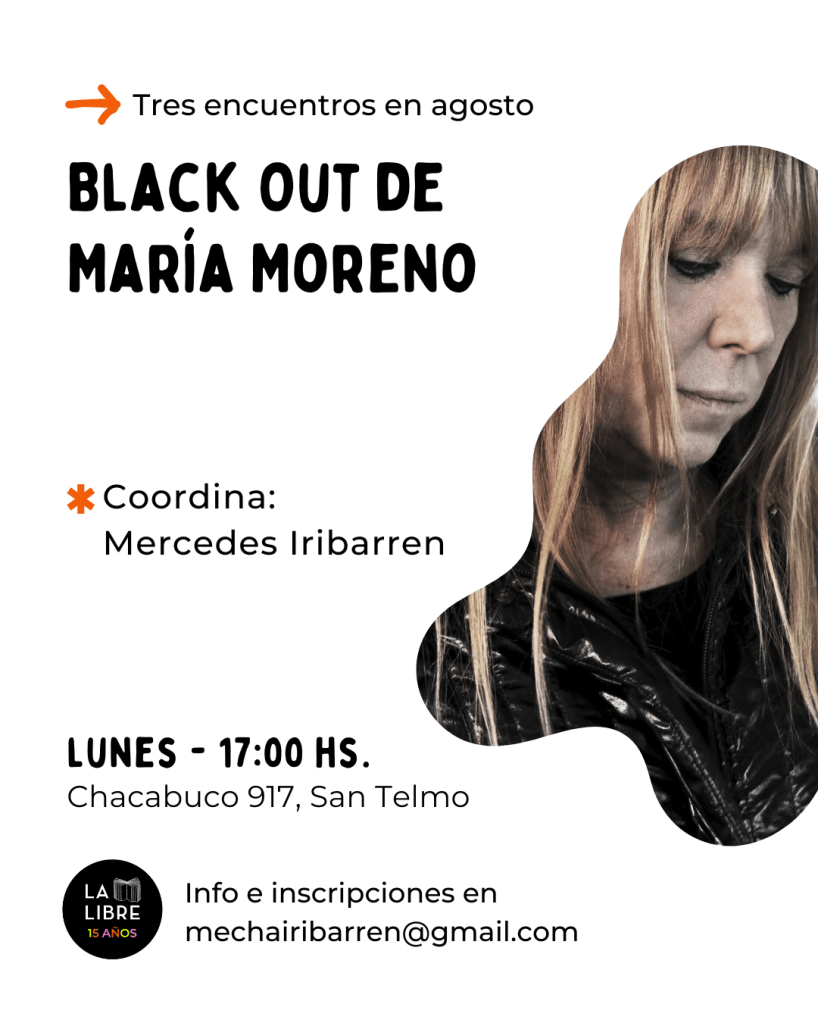 La propuesta es recorrer de manera colectiva y abierta el libro Black Out, de María Moreno. Para ello, se hará un repaso por la carrera literaria de la autora y se pondrá en relieve sus aportes a los ámbitos literarios a los que contribuyó (y sigue contribuyendo). Se propondrá una problematización del género autobiográfico a partir no sólo de este libro sino de fragmentos de otras obras de la misma autora. También, se explorarán ciertos temas significativos como el alcohol, el exceso, la camaradería, la mujer en el bar, el periodismo, el duelo.