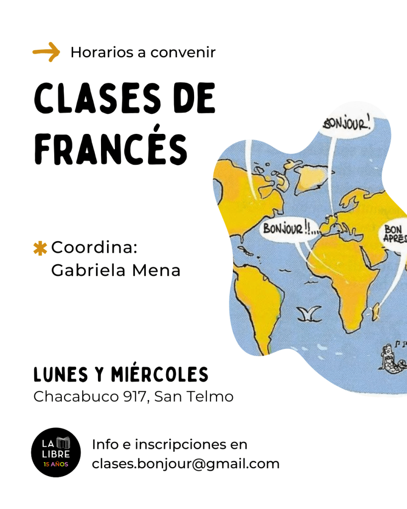 Gabriela Mena da clases de francés en escuelas de idiomas, en talleres universitarios y de forma particular hace diez años. Es una exploradora apasionada de la francofonía de diferentes latitudes. Después de haberse recibido de ingeniera en alimentos (UNQ), vivió durante seis años en Francia, donde trabajó haciendo mucho vino y aprendió que la capital blanca del Brie también era rica (entre otras cosas). El mundo del libro la terminó por conquistar a su regreso en Argentina: hizo diversos talleres de escritura (creativa, de viajes, etc.), cursó la diplomatura en artes del libro (UNA) y desde el año pasado transita la carrera de traducción técnico-literaria francés-español, en el Instituto Lenguas Vivas J.R.F. En modalidad virtual, da clases de francés y organiza encuentros de lectura en @clases.bonjour; en presencial, lo hace en San Telmo (¡acá mismo!) y en la Biblioteca Popular Sarmiento de Florencio Varela.