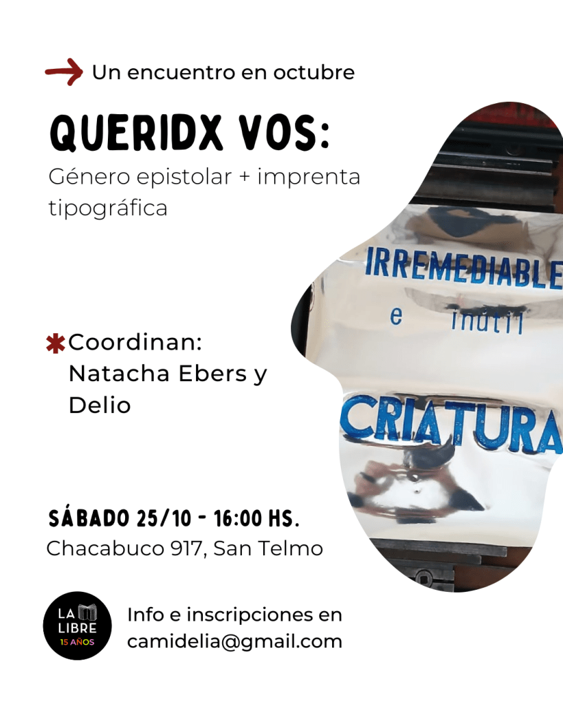 Queridx vos es una propuesta de taller práctica y teórica dirigida a curiosxs y entusiastas interesadxs en la lectura del género epistolar y en la imprenta tipográfica. Un encuentro de 3 horas de duración cada uno.