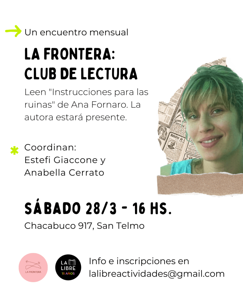En marzo leeremos «Instrucciones para las ruinas» de Ana Fornaro, quien estará presente. Para quienes participan hay un 10% de descuento en la compra del libro.