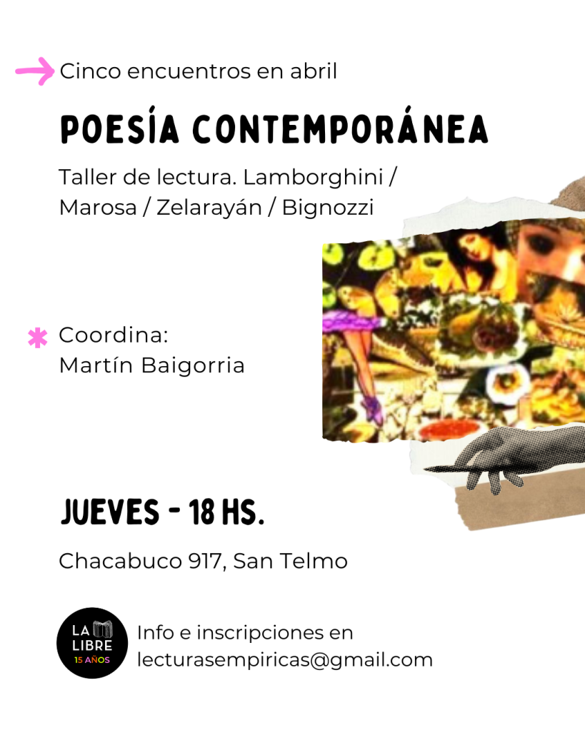 El curso propone una vía de entrada a algunos autorxs importantes dentro de la poesía actual: Leónidas Lamborghini, Marosa di Giorgio, Ricardo Zelarrayán y Juana Bignozzi. El objetivo es adquirir versatilidad en la lectura de poéticas muy diferentes entre sí, prestando atención a sus respectivas búsquedas e inquietudes. La dinámica de los encuentros será la presentación de cada obra y el intercambio de apreciaciones dirigidas a captar diversos aspectos, ya sea su registro emotivo, técnicas y temáticas o sus afinidades culturales. No se necesitan conocimientos previos más allá de las ganas de participar.
