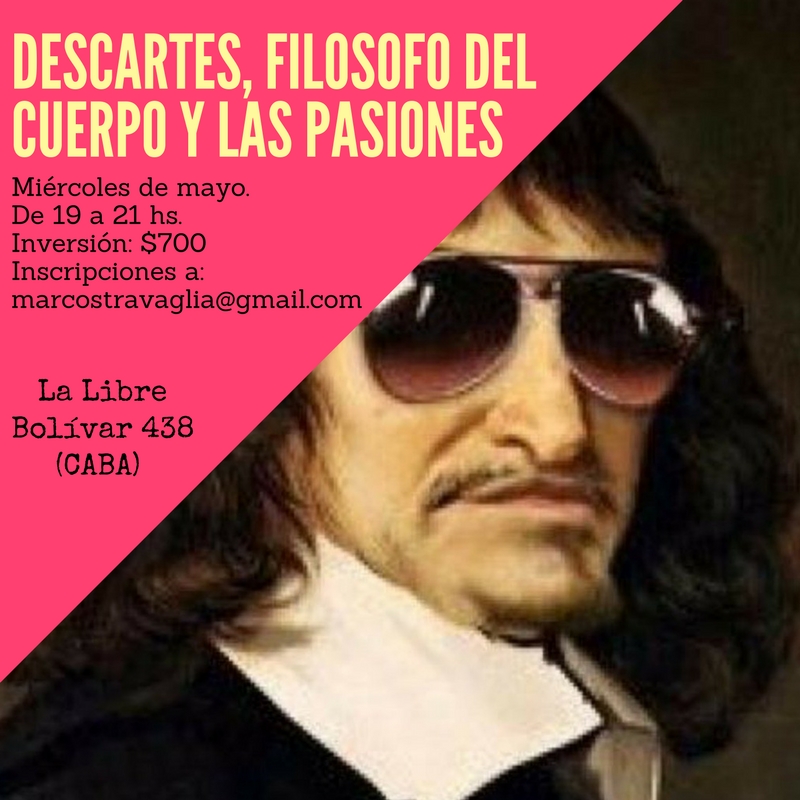 Nuevo taller en La Libre, Bolívar 438, los miércoles de mayo a las 19:00 horas. Acá te contamos de que se trata: Pocas veces identificamos a Descartes como un filósofo del cuerpo y las pasiones. Sin embargo, las reflexiones sobre qué son la mente y el cuerpo y cómo se vinculan, qué son una pasión, …